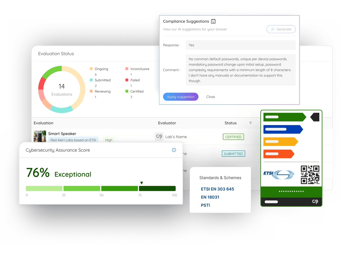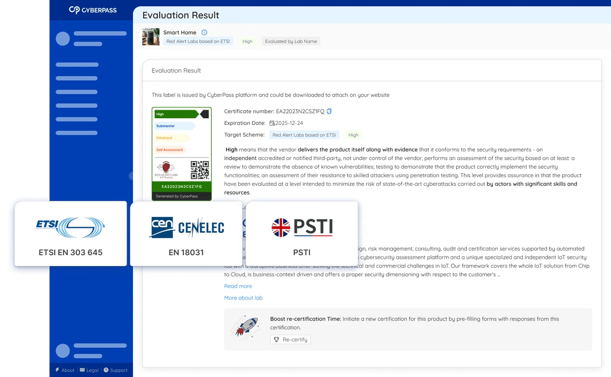 Ensure your products meet globally recognized cybersecurity standards through detailed evaluations, including ETSI EN 303 645 (CRA Ready), EN 18031 (RED Directive Ready), and PSTI. These assessments provide confidence in your product’s security by adhering to established industry benchmarks.